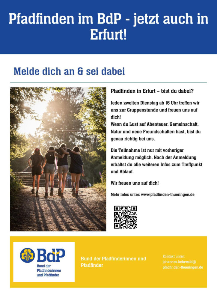 Wenn auch du zu den Pfadis in Erfurt möchtest, dann melde dich bei Johannes: johannes.kehrwald[at]pfadfinden-thueringen.de